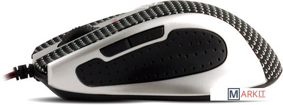 Игровая мышь с покрытием soft-touch и кабелем в тканевой обмотке. Оснащена двумя дополнительными кнопками и кнопкой смены разрешения.