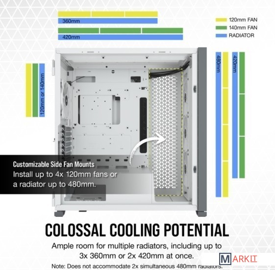 Конфигурация вентиляторов спереди 4x 120mm / 3x 140mmсверху 3x 120mm / 3x 140mmсзади 120mm / 140mmстенка МП 4x 120mm